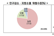 [문화투데이 김태균 기자] 수도권 시군 지방자치단체 10곳 중 8곳은 인구감소 및 지방소멸 위험을 심각하게 인식하고 있다는 조사 결과가 나왔다. 한국경제인협회(한경협)는 서울, 경기, 인천 등 수도권 및 광역시와 세종, 제주를 제외한 시군 지자체 120곳을 대상을 실시한 '인구감소·지방소멸 현황 및 과제' 조사 결과를 19일 발표했다. 조사 결과에 따르면 이번 조사에 참여한 비수도권 지자체 77.0%는 현재 인구감소·지방소멸 위험 수준을 '높다'고 평가했다. 권역별로는 강원권이 가장 많은 85.7%의 응답 지자체가 인구감소 및 지방소멸 위험 수준이 높다고 말했다. 이어 경상권(85.3%), 전라권(78.6%), 충청권(58.3%) 순으로 응답 비율이 높았다. 인구감소·지방소멸 위험 수준이 '높다'고 응답한 지자체는 그 원인으로 '산업·일자리 부족'(44.2%)을 가장 많이 꼽았다. '주택·주거환경'(21.4%), '의료·보건·돌봄'(17.5%), '교육·대학'(9.1%), '문화·여가'(3.9%)가 뒤를 이었다. 지역 인프라에 대한 평가에서도 '산업·일자리' 항목이 2.1점(5점 만점)으로 최저 점수를 기록했다. 이외에도 '교육·대학'(2.2점), '문화·여