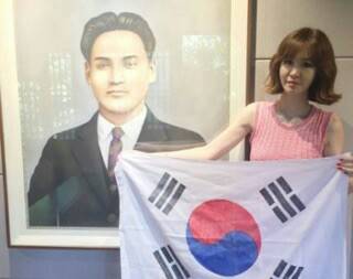 사진 속 그녀는 국기를 상징하는 듯한 빨간색과 파란색이 조화를 이룬 원피스를 입고 태극기를 들고있다.