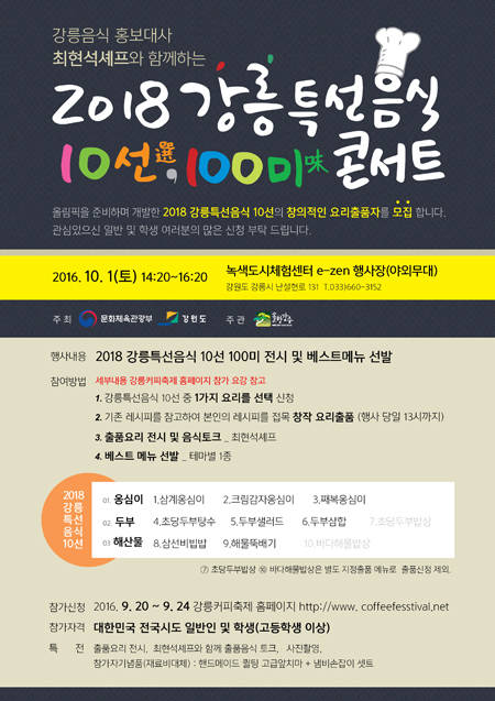 특히 내달 1일은 강릉 음식 홍보대사 최현석 셰프를 초청해 '최현석 셰프와 함께하는 강릉특선음식 10선 100미 콘서트'를 통해 축제 방문객에게 '2018 강릉특선음식'을 지속해서 홍보할 방침이다.