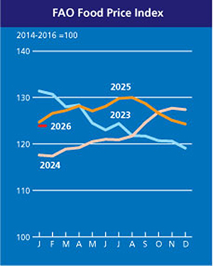 유엔 식량농업기구(FAO)가 6일(현지시간) 발표한 지난 1월 기준 세계식량가격지수(2014∼2016년 평균 가격이 100)는 123.9로 전달(124.3)보다 0.4% 하락했고, 1년 전보다는 0.6% 내렸다.