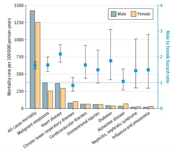 미국 국립암연구소(NCI) 세라 잭슨 박사팀은 미국의사협회 학술지 JAMA 네트워크 오픈(JAMA Network Open) 최근호에서 성인 4만7천여명을 대상으로 성별이 전체 사망과 사망원인 상위 9개 질환으로 인한 사망에 미치는 영향을 분석한 결과 남성이 여성보다 전체 사망 위험이 63% 더 높은 것으로 나타났다고 밝혔다.