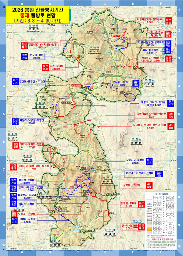통제 구간은 용화지구∼매봉∼묘봉∼북가치∼민판동(7㎞) 등 13개 구간이다.