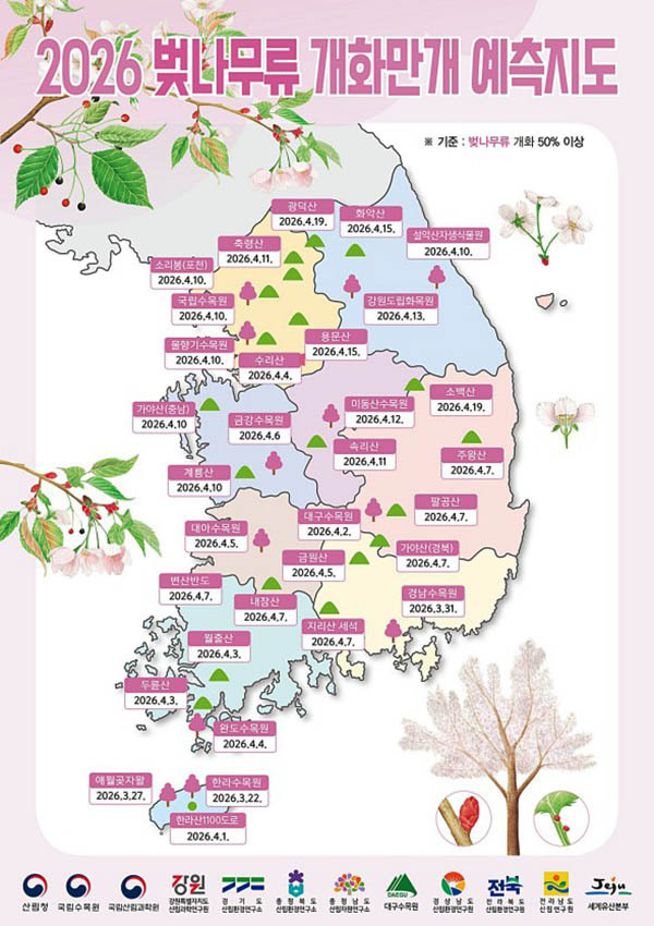 벚나무 개화 시기는 지역에 따라 차이가 있어 산림청이 지난달 24일 발표한 '2026 봄꽃 만개 예측지도'를 참고하면 된다.