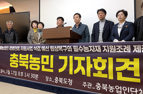 이 단체는 이날 도청 브리핑룸에서 기자회견을 열어 "타 지자체들은 농민의 생존권을 지키기 위해 발 빠르게 움직이고 있는데, 충북도는 올해 본예산을 편성하면서 벼 재배 농업인 경영안정 지원 예산 14억원을 삭감했다"며 이같이 요구했다.