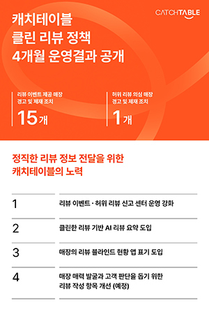 캐치테이블은 지난해 10월 허위나 대가성 리뷰 문제를 근절하고 캐치테이블 리뷰 신뢰도를 높이기 위해 클린 리뷰 정책을 도입했다.