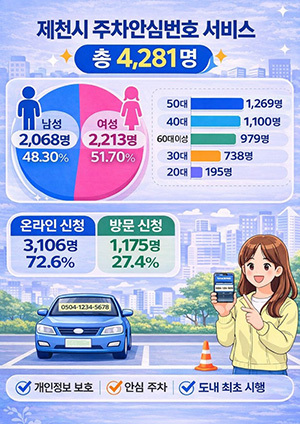 [문화투데이 황재연 기자] 충북 제천시는 도내 최초로 추진한 '주차안심번호' 서비스에 1년(지난해 3월 1일∼올해 2월 28일)간 4천281명이 신청했다고 21일 밝혔다.