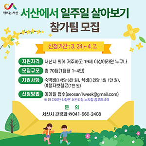 [문화투데이 장은영 기자] 충남 서산시는 '서산에서 1주일 살아보기'에 참가할 70팀(1팀당 최대 4명)을 다음 달 2일까지 모집한다고 24일 밝혔다.