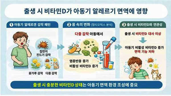 이후 연구진이 혈액 검사 등을 통해 아동들의 단백질체와 대사 물질을 통합 분석한 결과 여러 알레르기 항원에 동시 민감하게 반응하는 '다중 감작 아동'의 혈액에서는 체내에서 바로 작용하지 못하는 비활성형 상태의 비타민D가 증가한 것으로 나타났다.
