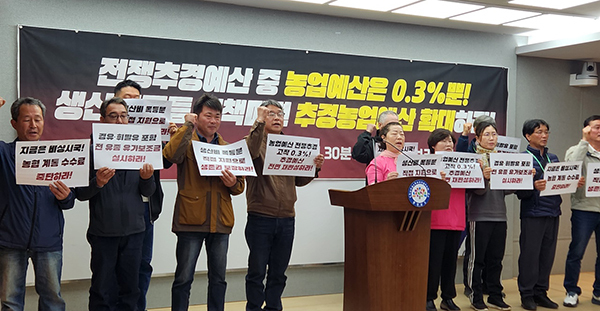 전국농민회총연합 충남도연맹과 전국여성농민회총연합 충남연합, 충남친환경농업협회는 이날 충남도청에서 기자회견을 열고 농업 생산비 폭등분을 전액 보전하는 '전쟁 추경'을 즉각 편성해야 한다고 밝혔다.
