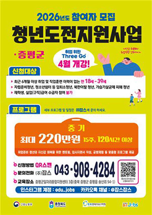 [문화투데이 황재연 기자] 충북 증평군은 청년들에게 무료로 취업 교육을 제공하는 '청년도전지원사업' 참가자를 모집한다고 21일 밝혔다.
