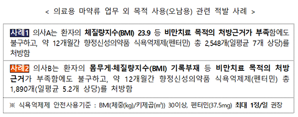 적발 사례 중에서는 비만 치료 목적의 처방 근거가 부족하지만 약 1년간 향정신성의약품 식욕억제제인 펜터민을 모두 2천548개 처방한 경우가 있었다. 펜터민은 체질량지수(BMI)가 30 이상인 경우 하루에 펜터민(37.5㎎) 최대 1개(정) 처방이 권장되지만, 근거 없이 하루에 7개 정도를 처방한 셈이다.