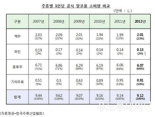 우리나라의 알코올 소비량을 주종별로 보면 증류주가 6.07리터(소주 5.69리터, 증류식소주 등 기타증류주 0.38리터), 맥주 2.01리터, 와인 등 기타주류가 1.04리터인 것으로 분석되어 2011년과 차이가 거의 없는 것으로 분석되었다.