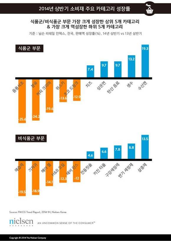 이 같은 소비자의 기호에 대해 닐슨코리아 소매유통조사본부 관계자는 “전반적으로 대부분의 소비재 시장이 역성장을 기록한 가운데, 식음료 부문에서는 전통적으로 불황에 강한 편의가공식 시장 외에 주류 (+4.2%) 및 음료 시장만이 전년 동기 대비 플러스 성장을 기록했다”면서 “소비재 산업은 기후 및 인구통계학적 변화와 소비자 라이프스타일의 변화가 가장 빠른 속도로 반영되는 상황을 보여주는 예”라고 말했다.