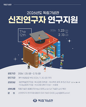 [문화투데이 장은영 기자] 독립기념관은 독립운동사 연구의 미래를 이끌어갈 인재를 발굴하고 학문적 토대를 강화하기 위해 다음 달 13일까지 '2026년도 신진 연구자 연구지원 사업'을 공모한다고 22일 밝혔다.