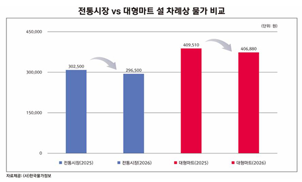 전문가격조사기관인 한국물가정보가 설을 앞두고 4인 가족 기준 차례상 비용을 조사한 결과 전통시장은 약 29만6천500원으로 지난해보다 1.98% 감소한 것으로 나타났다.