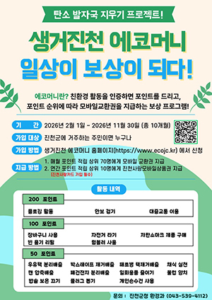 [문화투데이 황재연 기자] 충북 진천군은 탄소중립 실현을 위해 '생거진천 에코머니 사업'을 다음 달부터 본격 추진한다고 29일 밝혔다.