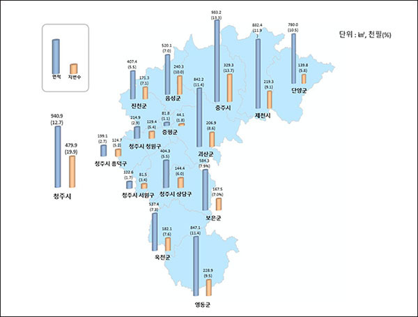 이어 청주시(941㎢·12.7%), 제천시(883㎢·11.9%), 영동군(847㎢·11.4%), 괴산군(842㎢·11.4%), 단양군(780㎢·10.5%), 보은군(584㎢·7.9%), 옥천군(537㎢·7.3%), 음성군(520㎢·7%), 진천군(407㎢·5.5%), 증평군(82㎢·1.1%) 순이다.