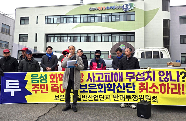 이들은 "최근 도내 산업단지에서 화학물질 유출과 대형 화재 등이 잇따르는 상황인데, 주민의 생명과 재산을 보호해야 할 충북도와 보은군이 위험시설을 마을 인근에 설치하겠다는 게 말이 되느냐"고 목청을 높였다.