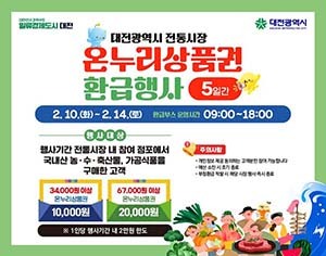 [문화투데이 장은영 기자] 대전시는 설 연휴 기간인 10∼14일 농림축산식품부, 해양수산부와 함께 '전통시장 온누리상품권 환급행사'를 진행한다고 5일 밝혔다.