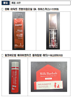 이번에 회수 조치되는 제품은 '쌍빠 어딕트 프렌치립오일 04. 히비스커스'와 '밀크바오밥 베이비앤키즈 컬러립밤 레드'다.