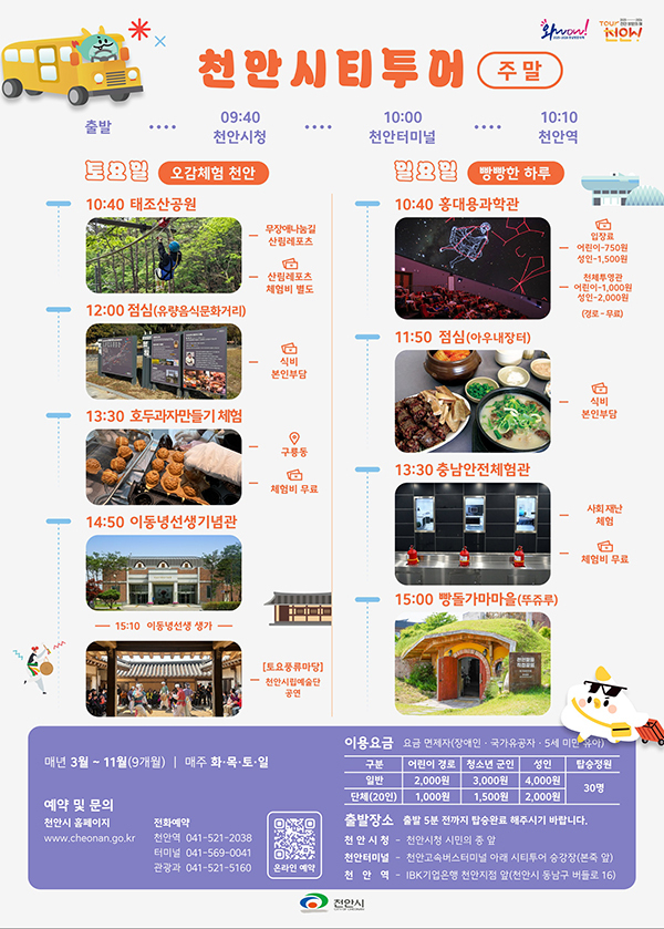 [문화투데이 장은영 기자] 충남 천안시는 다음 달부터 11월까지 시티투어를 본격적으로 운영한다고 9일 밝혔다.
