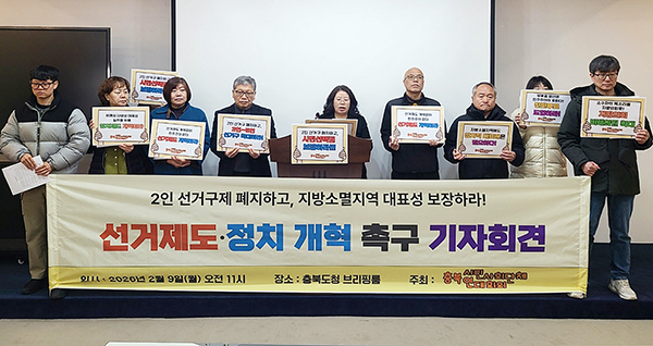 이 단체는 또 "지방소멸과 인구감소가 심각해지는 상황에서 충북 일부 지역은 인구수만을 기준으로 선거구 축소나 폐지 위험에 놓여 있다"며 "지방선거 구획 조정 시 인구감소라는 단일 지표에 매몰되지 말고, 지방소멸 대응과 지역 공동체의 존엄성을 고려한 종합적인 기준을 마련해야 한다"고 강조했다.