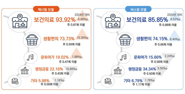 이용 행태를 살펴보면 택시형 서비스와 버스형 모두 병원과 약국 등 보건·의료시설 이용 비중이 높았다.
