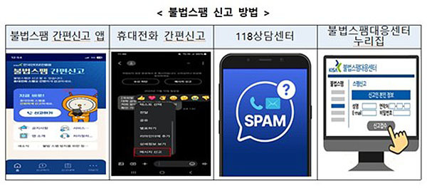 방미통위는 의심되는 문자에 포함된 인터넷주소를 절대 누르지 말고 전화도 받지 않아야 하며 불법 스팸 간편 신고 앱과 휴대전화 간편 신고, 불법스팸대응센터(☎118)에 신고해 이용자 피해 확산 방지에 참여해 달라고 당부했다.