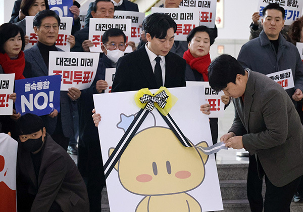 연대는 이날 '대전의 미래, 주민투표', '시민 없는 통합 절대 불가' 등의 피켓을 들고 주민투표를 촉구하는 한편 시민들과 소통하지 않는 정부 여당을 비판하는 취지로 대전시 캐릭터 '꿈돌이' 영정사진을 만드는 퍼포먼스를 벌이기도 했다.