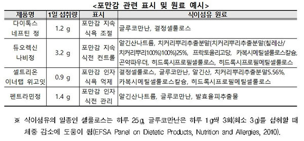 '포만감 지속'을 표시한 제품 4개에는 셀룰로스, 글루코만난 등 식이섬유가 함유돼 있었지만, 하루 섭취량이 적어 포만감을 유발할 수 있는 수준에 미치지 못하는 것으로 확인됐다.