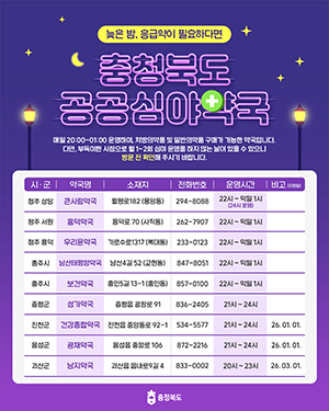 공공심야약국 운영 관련 자세한 사항은 도 식의약안전과(☎ 043-220-3183)로 문의하면 된다.