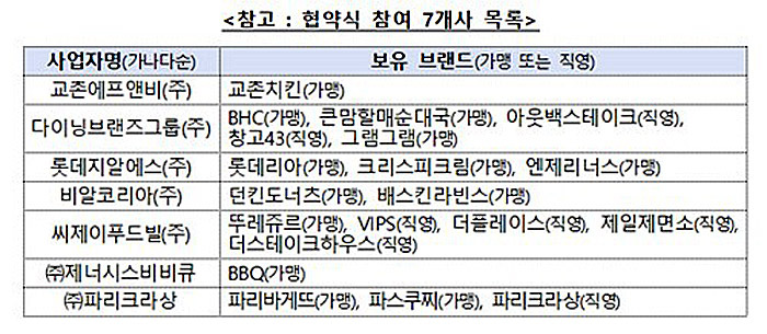 협약에 참여한 기업은 교촌에프앤비, 다이닝브랜즈그룹, 롯데GRS, 비알코리아, CJ푸드빌, 제너시스BBQ, 파리크라상이다.