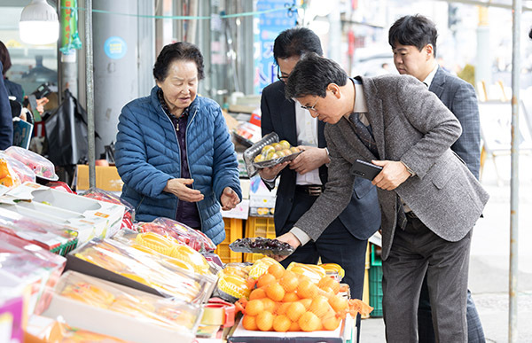 김돈곤 군수와 직원들이 장날을 맞은 청양 전통시장을 방문해 직접 물건을 구매하며 시장 분위기를 살폈다.