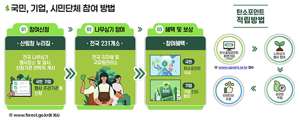 전국 220곳에서 국민 참여형 나무심기 행사를 개최하고, 전국 133곳에서 46만본의 묘목을 무상 분양한다.