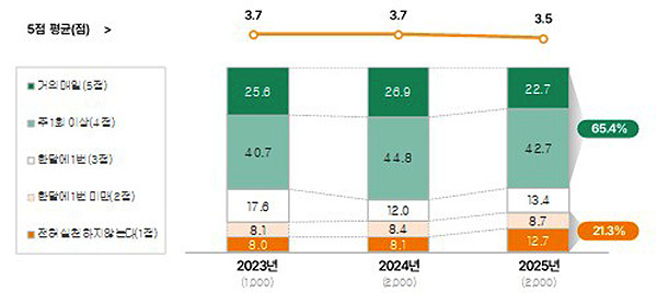규칙적인 운동 실천 수준을 묻는 항목에서 '운동을 전혀 하지 않는다'고 답한 비율은 2023년과 2024년 각각 8.0%, 8.1%였으나, 2025년에는 12.7%로 늘었다.
