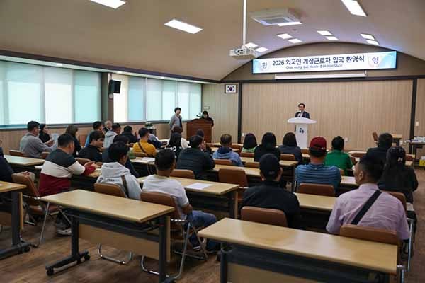 군은 지난 26일 매포읍 단양군 농업인복지회관에서 계절근로자와 고용주, 초청인이 참여한 가운데 근로계약을 체결하고 임금 지급 방식, 근로 준수사항 등을 안내했다.