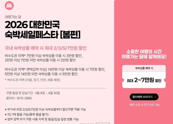 행사 관련 자세한 내용은 한국관광공사 대한민국 구석구석 누리집 내 '2026 대한민국 여름맞이 숙박세일 페스타'(ktostay.visitkorea.or.kr) 또는 전담 콜센터(☎1670-3980)로 문의하면 된다.