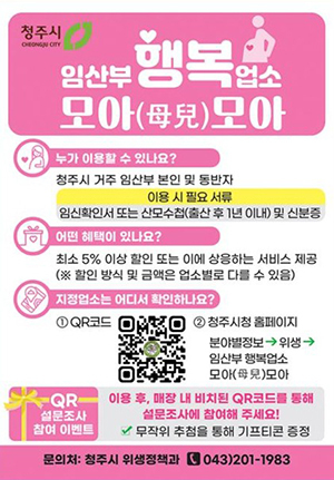 [문화투데이 황재연 기자] 청주시는 임산부에게 할인 혜택을 주는 '행복업소 모아 모아' 사업을 확대 운영한다고 6일 밝혔다.
