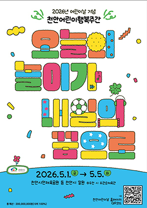[문화투데이 장은영 기자] 충남 천안시는 제104회 어린이날을 맞아 다음 달 1∼5일 시내 곳곳에서 '2026 천안어린이행복주간'을 운영한다고 6일 밝혔다.
