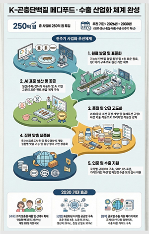 농진청은 올해부터 2030년까지 산·학·연·관과 협력해 산업 현장의 병목현상을 해소하고, K-곤충단백질의 특수의료용도식품(메디 푸드) 소재화와 수출 산업화 체계를 구축할 계획이다.