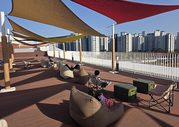 도서관은 탁 트인 야외 공간인 하늘정원에 캠핑 의자와 빈백, 캠핑 박스 등을 설치해 이용자들이 편안하게 책을 읽으며 쉴 수 있도록 꾸몄다.