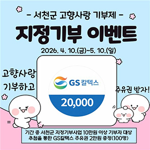 [문화투데이 장은영 기자] 충남 서천군은 다음 달 10일까지 10만원 이상 지정 기부하면 100명을 추첨해 2만원 상당의 모바일 주유권을 지급한다고 10일 밝혔다.