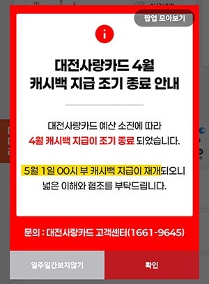 [문화투데이 장은영 기자] 대전 지역화폐인 대전사랑카드 이달치 캐시백 지급이 예산 소진으로 조기 종료됐다.