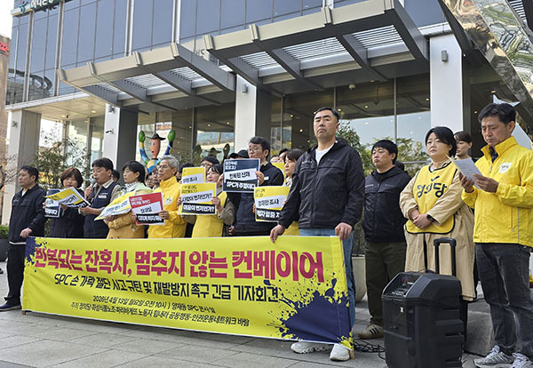 단체들은 이날 서울 서초구 양재동 상미당홀딩스(SPC) 본사 앞에서 기자회견을 열고 "속도를 내지 않으면 생산량을 맞출 수 없는 공장에서 노동자들은 무리할 수밖에 없었다"며 "산재가 반복되는 것은 우연이 아니라 필연"이라고 비판했다.