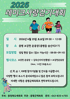 [문화투데이 황재연 기자] 충북 증평군은 오는 25일 보강천 일원에서 '2026 레이크사랑 걷기대회'를 개최한다고 21일 밝혔다.