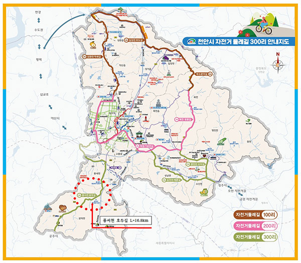 이로써 천안 동서남북을 연결하는 총 121㎞의 순환형 자전거 네트워크 구축이 마무리 단계에 접어들었다. 전체 구간 중 105㎞(87%)가 완료된 상태다.