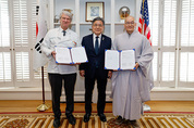 [연합] 대한불교조계종 한국불교문화사업단은 12일(현지시간) 미국 명문 요리학교 CIA(The Culinary Institute of America)와 한국 사찰음식 교육 및 문화교류 협력을 위한 업무협약을 체결했다고 밝혔다. 뉴욕 현지에서 이뤄진 업무협약식에는 불교문화사업단 단장 일화스님과 브렌던 월시 CIA 학장, 허민 국가유산청장이 참석했다. 이번 협약에 따라 양 기관은 앞으로 CIA 교육과정 내에 한국 사찰음식과 한국 음식문화에 대한 교육 프로그램을 공동으로 운영하고 강연, 워크숍, 교수진·학생 교류 등 다방면의 협력도 추진할 계획이다. 특히 채소, 곡물, 허브, 제철 식재료를 활용한 식물성 중심 조리 교육을 통해 사찰음식이 지닌 철학과 지속가능한 식문화 가치를 세계 요리 인재들에게 소개할 예정이라고 사업단은 설명했다. 일화스님은 "양 기관의 지속적인 교육과 연구 협력을 통해 한국 사찰음식이 글로벌 식문화 속에서 더 폭넓게 논의되고 확산되기를 기대한다"고 말했다. CIA는 프랑스 르 코르동 블루, 일본 쓰지조리사전문학교와 더불어 세계 3대 요리학교로 꼽히는 곳으로, 불교문화사업단은 앞서 르 코르동 블루 런던 등과도 업무협약을 체결하고 사찰음식을 정규과